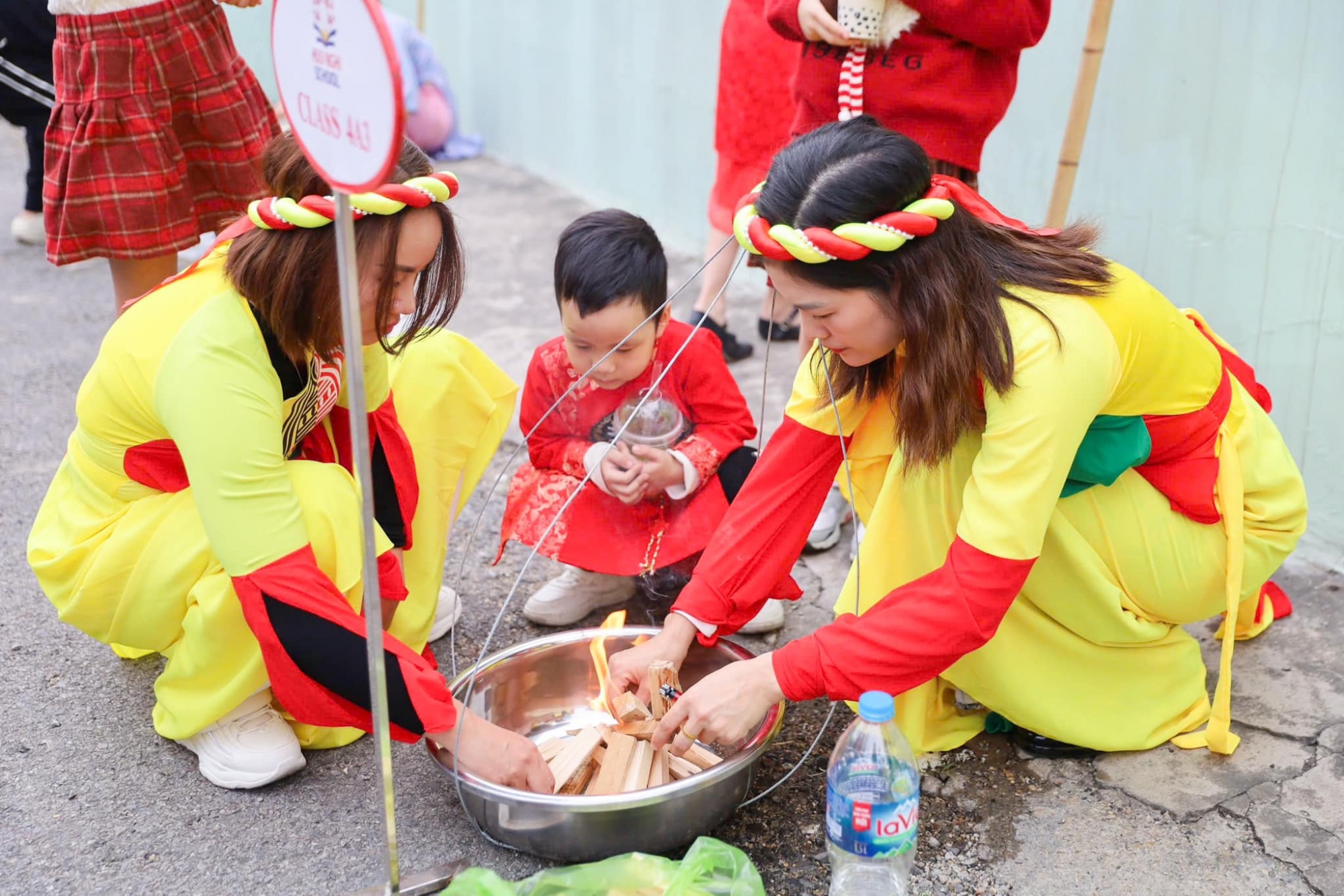 Hấp dẫn và thử thách nhất tại hội chợ chính là hoạt động nấu cơm bằng niêu đất. Học sinh cùng phụ huynh sẽ cùng nhau nhóm bếp, giữ lửa, chờ đợi từng hạt cơm chín dẻo, cảm nhận hơi ấm gia đình trong từng làn khói bếp. Không chỉ là một trải nghiệm thú vị, hoạt động này còn giúp các em hiểu hơn về cuộc sống của cha ông ta thời xưa, rèn luyện tính kiên nhẫn và tinh thần teamwork.